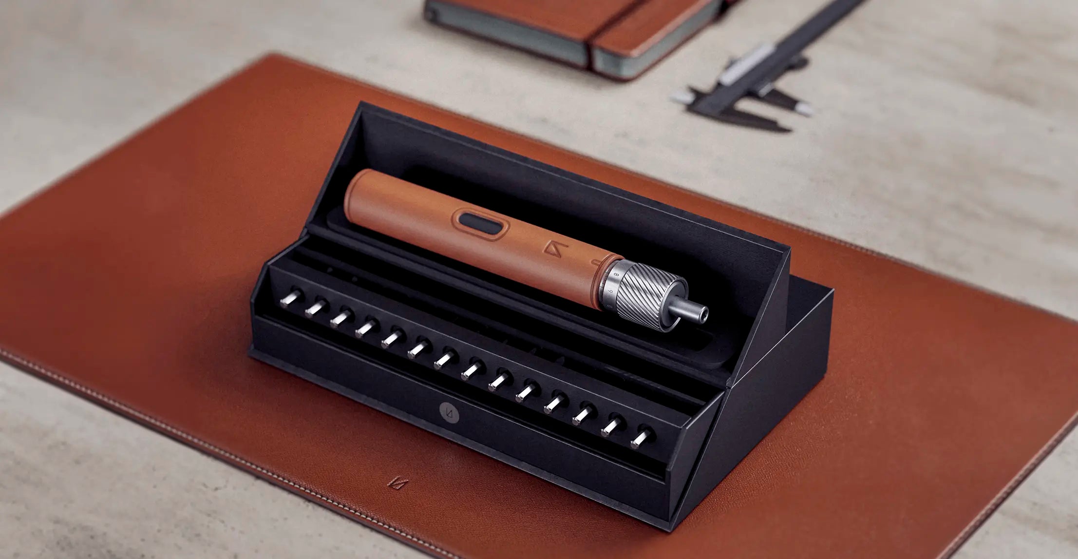 The Rota-Master precision electric screwdriver set features a brown full-grain calf leather grip with a hand-stitched basting pattern and an aerospace-grade aluminium torque adjustment collar.