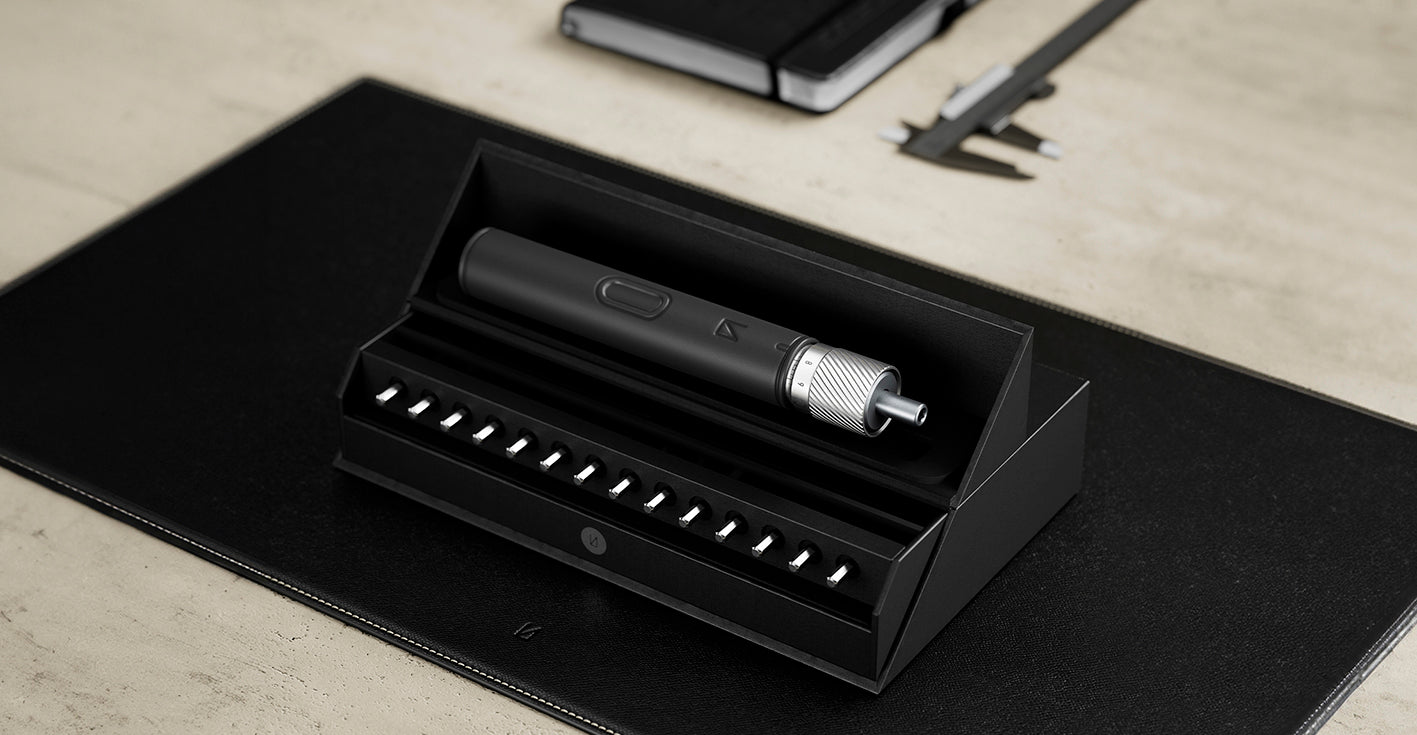 The Rota-Master precision electric screwdriver set features a black full-grain calf leather grip with a hand-stitched basting pattern and an aerospace-grade aluminium torque adjustment collar.