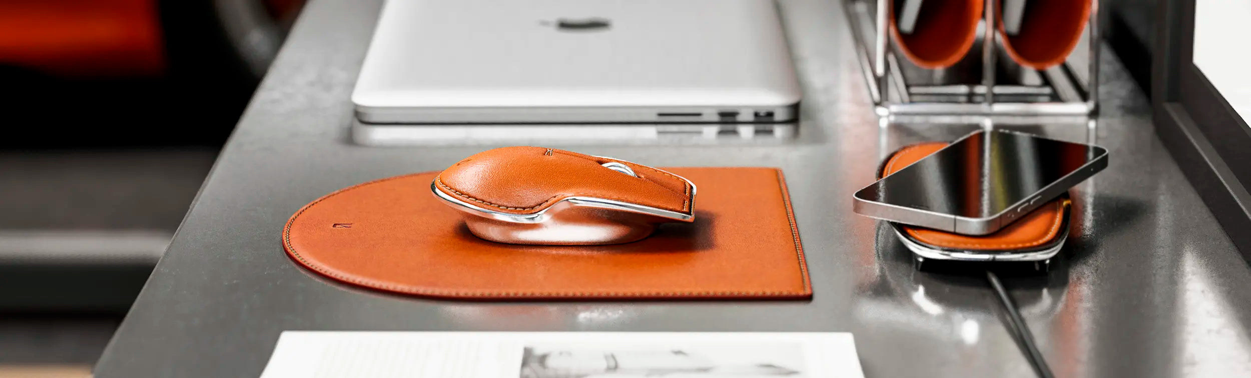 Crafted from ethically sourced full-grain French leather and precision-formed metalwork — including titanium plating and gold alloy components. Each metal part is made in-house, from raw material to final polish, ensuring precision and integrity at every step. Hand-polished, hand-assembled, and designed for a lifetime of use, this is more than an artisan-made computer mouse — it’s an heirloom.