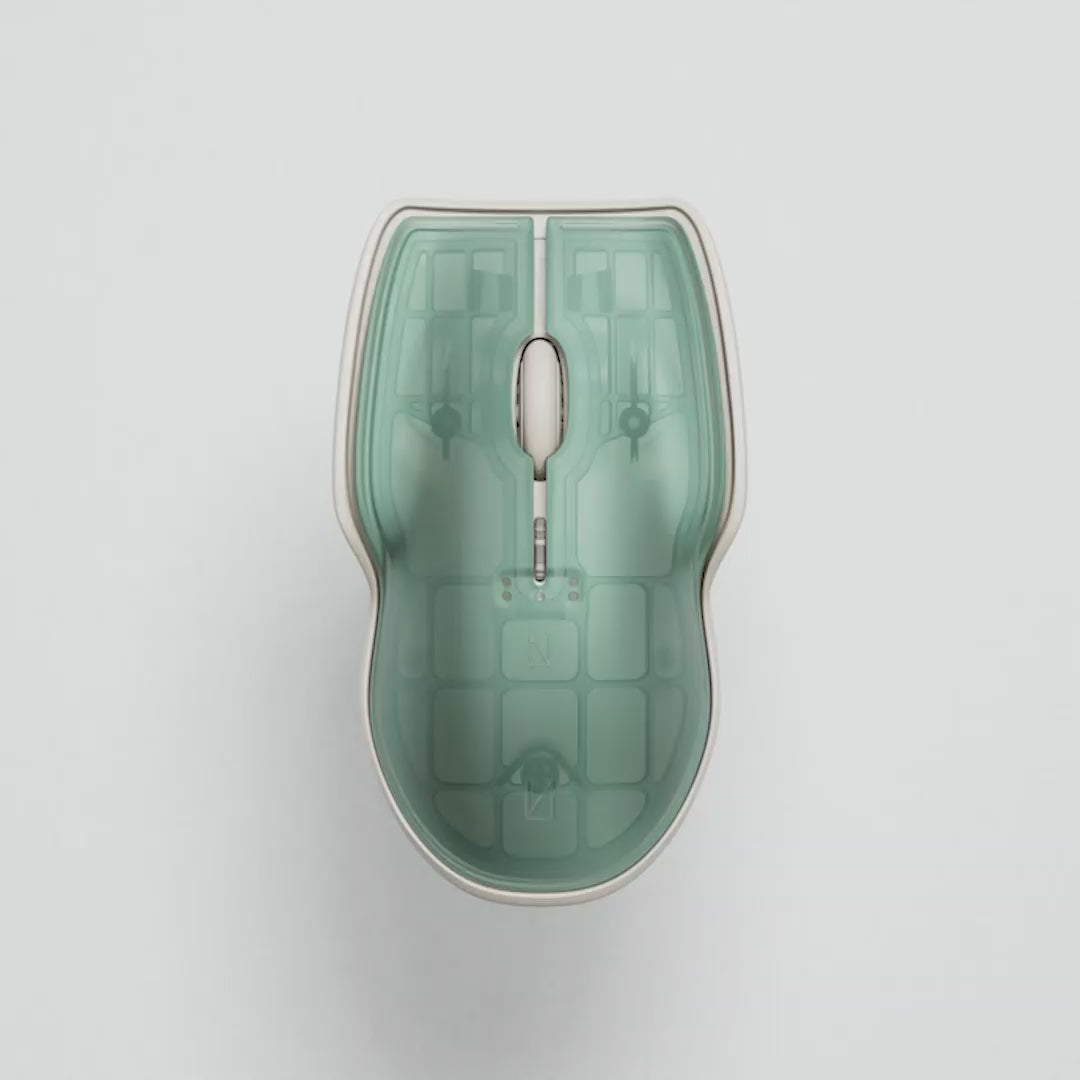 The Emerald Blanc white computer mouse features a translucent green top cover with minimalistic detailing and a powder-coated solid aluminium base, which requires little to no maintenance.