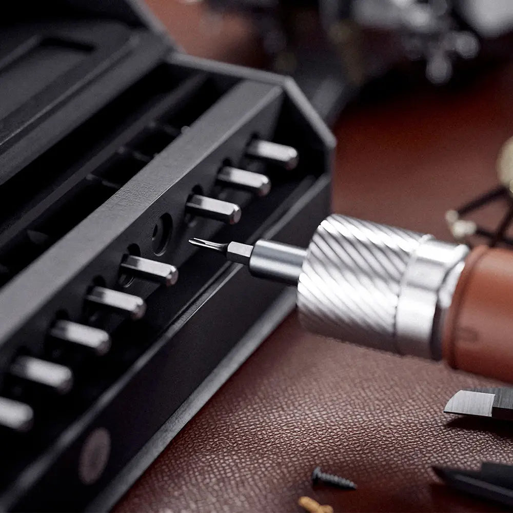 The hand-stitched full-grain calf leather grip provides excellent comfort and durability, enhancing grip during use. The torque adjustment collar, crafted from solid aerospace-grade aluminium and hand-polished to a mirror finish, offering robust functionality and a striking appearance. Each electric screwdriver is meticulously hand-assembled, ensuring precision fit and premium quality.