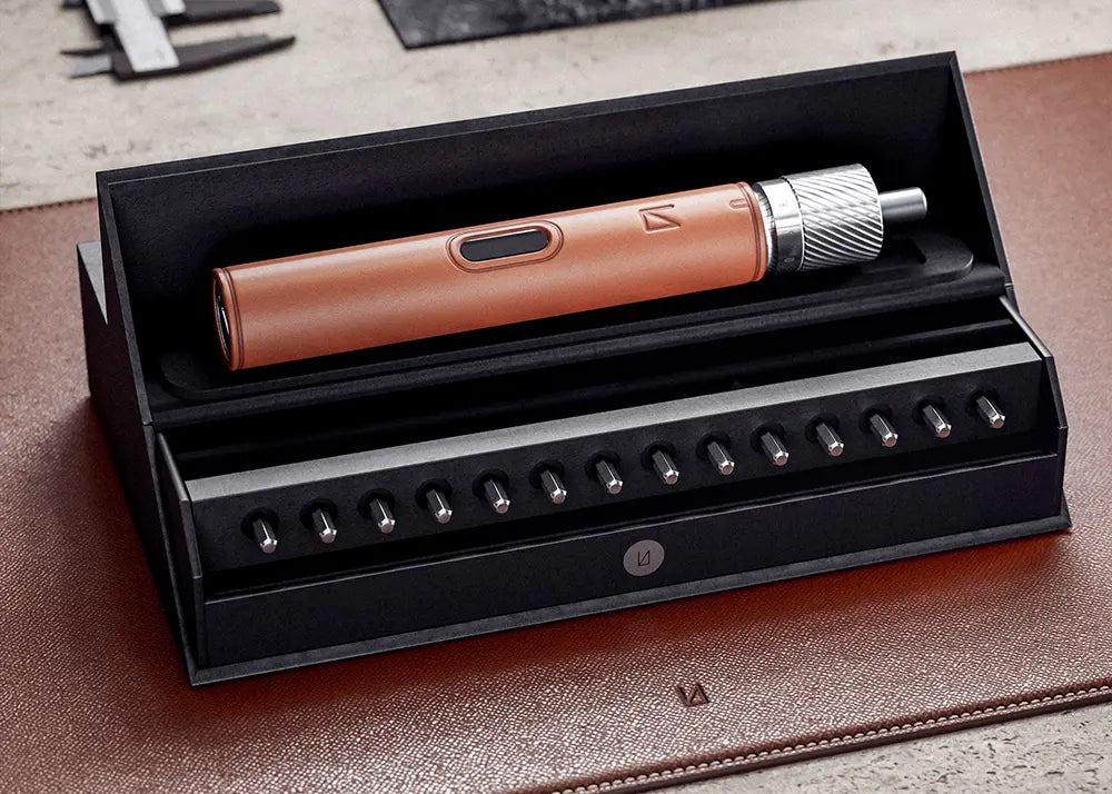 The Rota-Master precision electric screwdriver set features a brown full-grain calf leather grip with a hand-stitched basting pattern and an aerospace-grade aluminium torque adjustment collar.