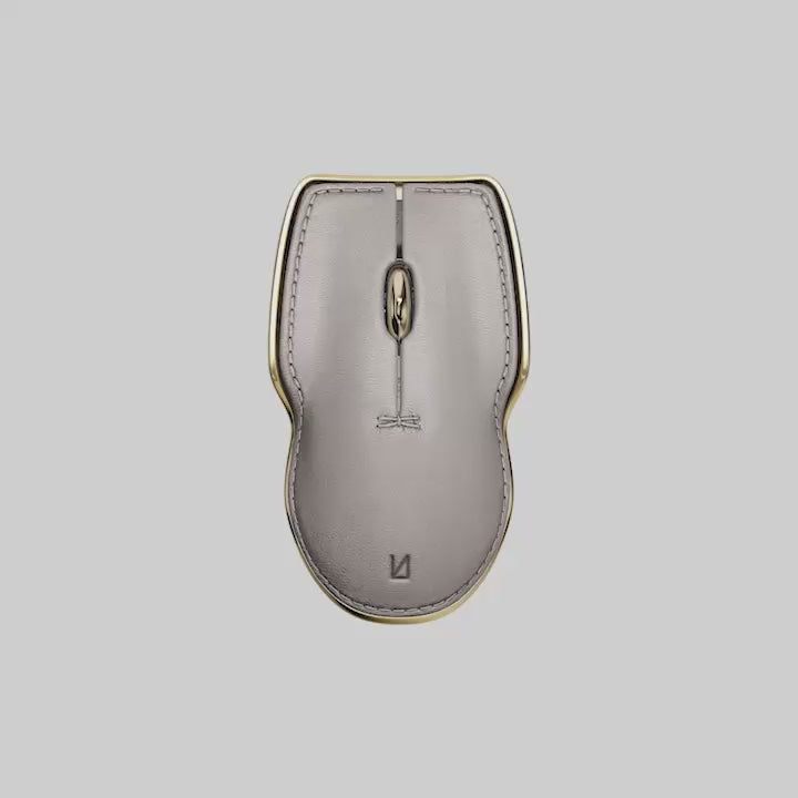 The Pointer Instrument is a hand-assembled, ambidextrous computer mouse featuring full-grain calf leather, equestrian-style stitching and gold tone plated solid aluminium. This elegant grey leather computer mouse is carefully engineered to accommodate future repairs and component replacements for lifelong durability.